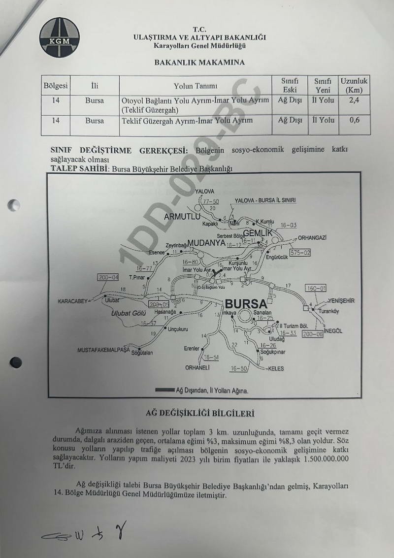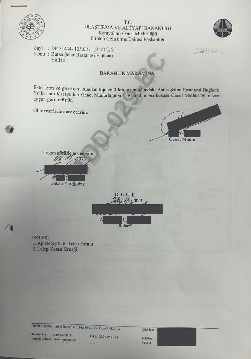 • Bu talep doğrultusunda Karayolları Genel Müdürlüğü tarafından 28.11.2023 tarih ve 204951 sayılı Bakanlık Olur’u ile yol resmen Karayolları sorumluluğuna devredilmiştir.
