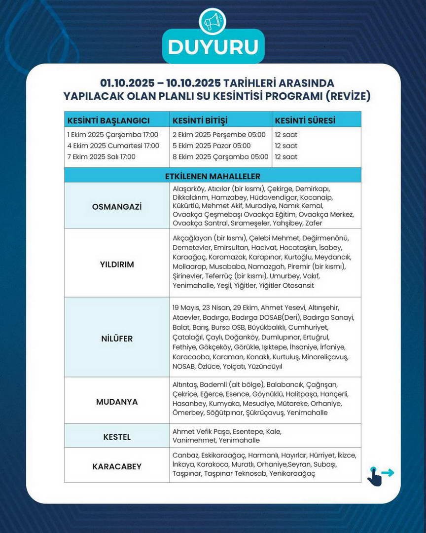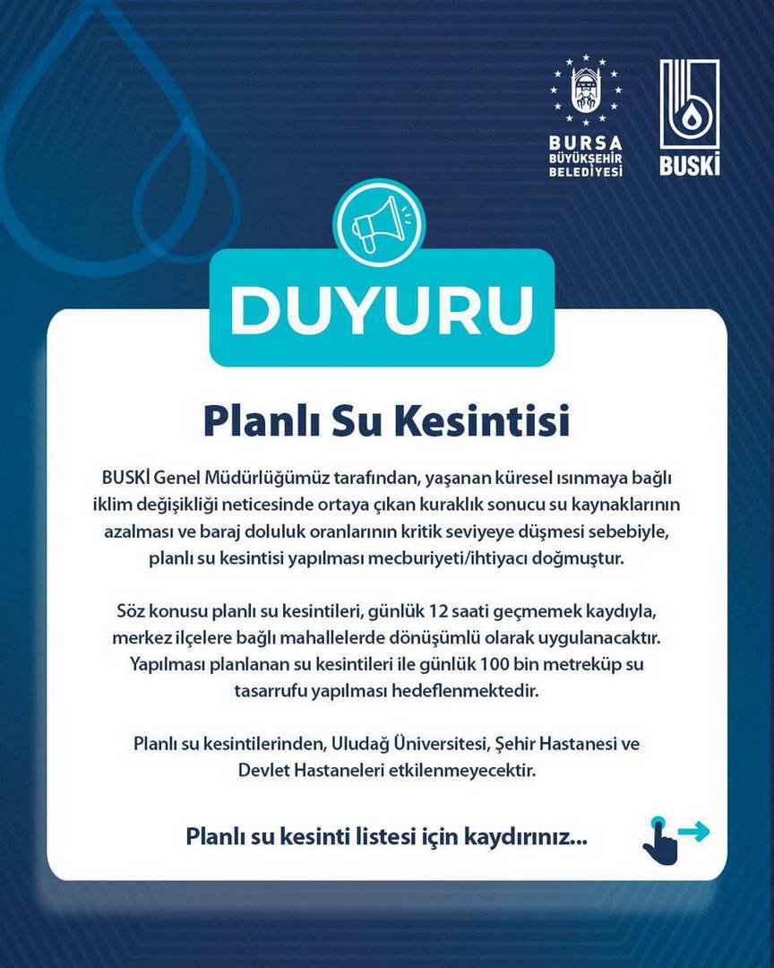 Söz konusu planlı su kesintileri, günlük 12 saati geçmemek kaydıyla, merkez ilçelere bağlı mahallelerde dönüşümlü olarak uygulanacaktır. Yapılması planlanan su kesintileri ile günlük 100 bin metreküp su tasarrufu yapılması hedeflenmektedir. Planlı su kesintilerinden, Uludağ Üniversitesi, Şehir Hastanesi ve Devlet Hastaneleri etkilenmeyecektir. Planlı su kesinti listesi ekte sunulmuştur” denildi.