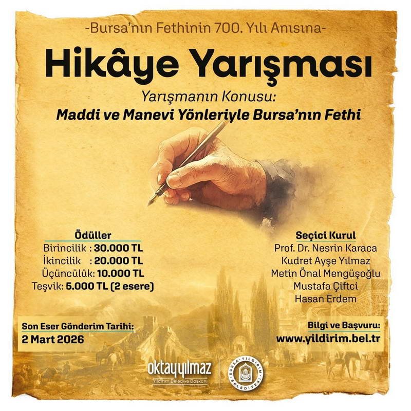 Yıldırım Belediyesi, Bursa’nın fethinin 700. yılını anlamlı bir şekilde anmak amacıyla iki ayrı alanda yarışma düzenliyor. Hikâye ve minyatür dallarında gerçekleştirilecek yarışmalarda, katılımcılar Bursa’nın fethini hem maddi hem de manevi yönleriyle ele alacak. Tarihî derinliği ve kültürel zenginliğiyle öne çıkan Bursa’nın fethini farklı açılardan gündeme taşımayı amaçlayan yarışmalar, edebiyatın etkileyici anlatım gücüyle minyatür sanatının zarif dokunuşlarını bir araya getiriyor.