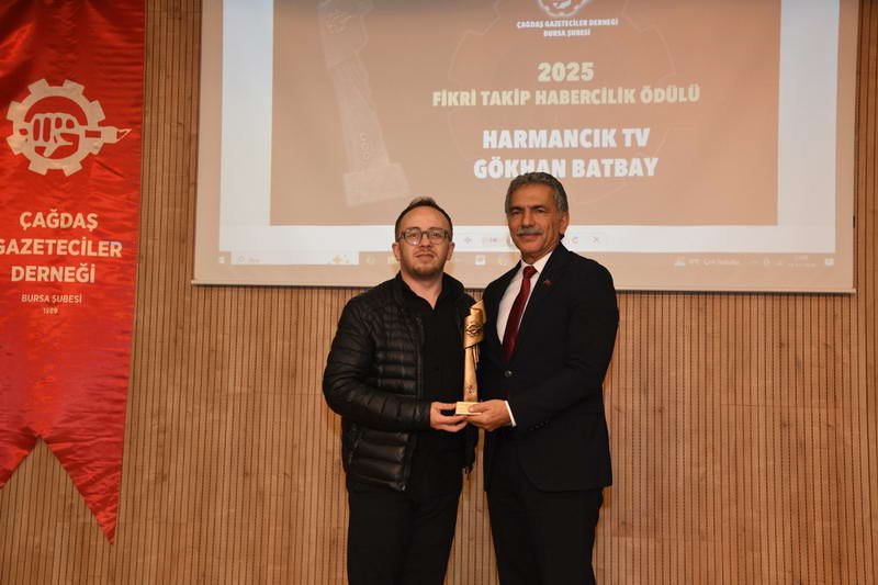 Sahanın en zorlu koşullarında görev yapan Harmancık TV Muhabiri Gökhan Batbay’a “Fikri Takip – Habercilik” ödülünü Gemlik Belediye Başkanı Şükrü Deviren verdi.