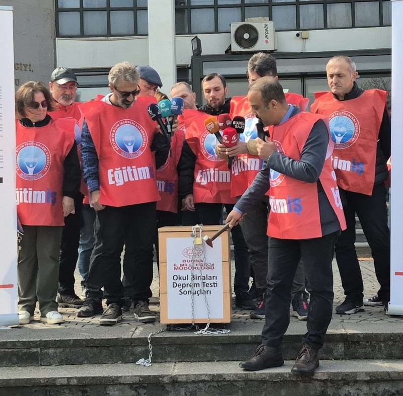 Eğitim-İş Bursa Şube Başkanı Özkan Rona, Bursa İl Milli Eğitim Müdürlüğü önünde yaptığı zehir zemberek açıklamada, okulların deprem dayanıklılık raporlarının “ticari sır” gerekçesiyle saklanmasına yönelik açtıkları davayı kazandıklarını duyurdu.