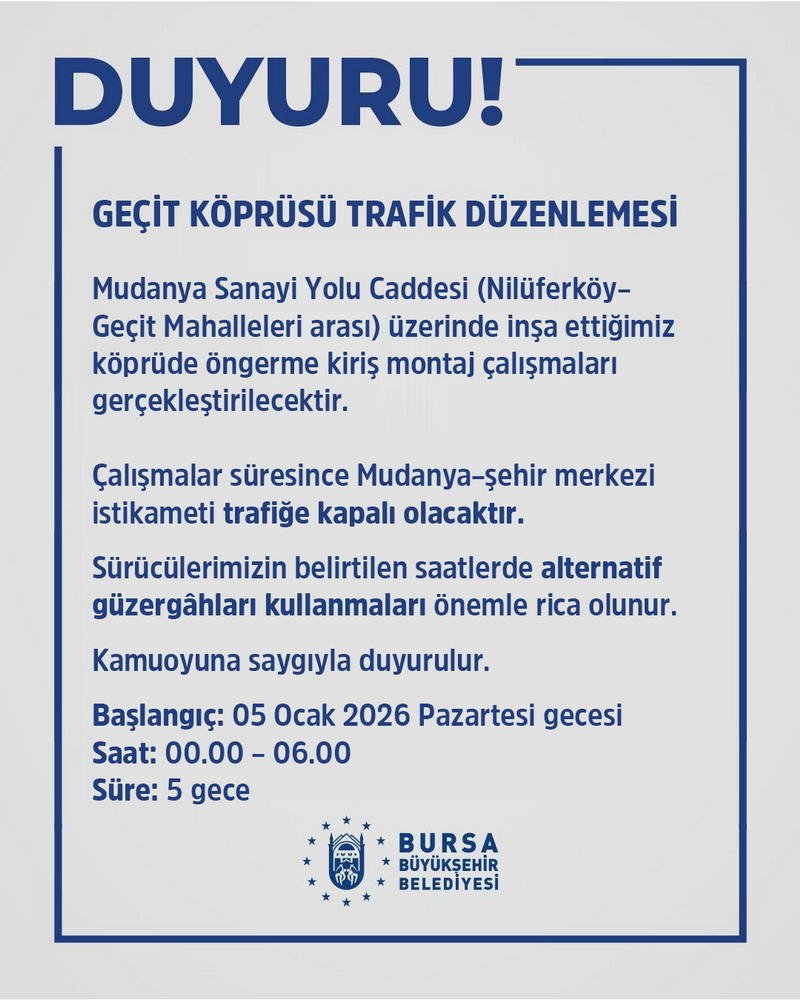 Montaj çalışmalarına 05 Ocak 2026 Pazartesi gecesi başlanacak olup, çalışmaların 5 gece sürmesi planlanmaktadır. Çalışmalar süresince, 00.00 – 06.00 saatleri arasında Mudanya–şehir merkezi istikametindeki yol trafiğe kapatılacaktır.