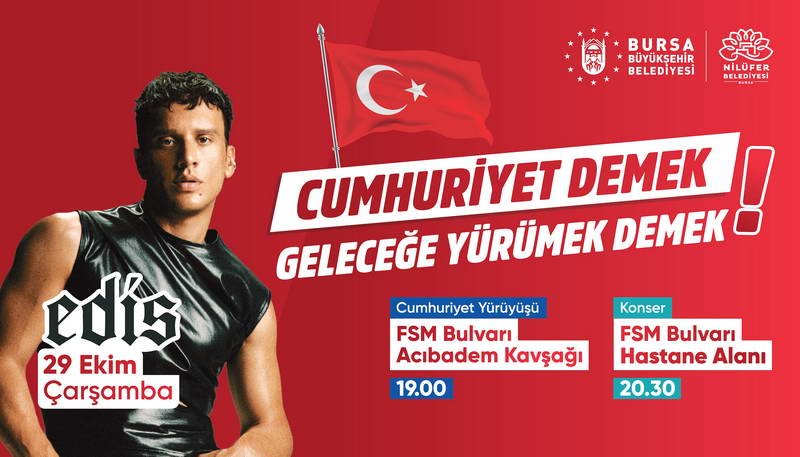 29 Ekim Cumhuriyet Bayramı etkinlikleri kapsamında Büyükşehir Belediyesi ve Nilüfer Belediyesi iş birliğiyle Fatih Sultan Mehmet Bulvarı’nda yapılacak olan ‘Cumhuriyet Yürüyüşü’ ile coşku doruğa çıkacak. Saat 19.00’da bir araya gelecek olan Cumhuriyet sevdalıları, ellerinde Türk Bayrakları ve Ata posterleriyle hep bir ağızdan şarkılar ve marşlar söyleyerek Cumhuriyet’i doyasıya yaşayacak. Saat 20.30’da Nilüfer Hastane Alanı’ndaki Edis konseriyle de Cumhuriyet Bayramı coşkusu perçinlenecek. Sevilen şarkılarını Bursalılar için seslendirecek olan Edis, muhteşem sahne şovuyla da vatandaşlara unutulmaz bir gece yaşatacak.