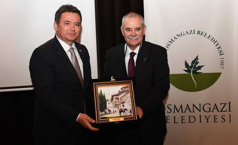 Düzenlenen söyleşinin ardından Osmangazi Belediye Başkanı Erkan Aydın, Cumhuriyet Vakfı Genel Sekreteri Işık Kansu’ya günün anısına hediye takdim etti.