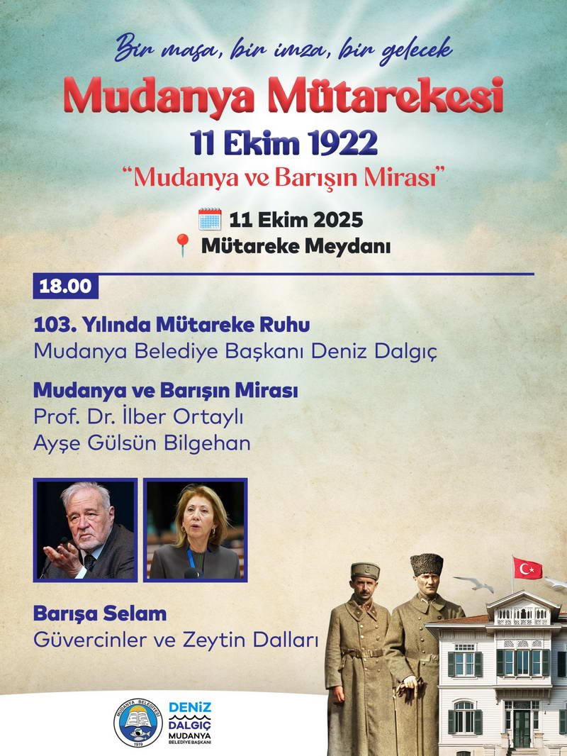 “Mudanya Mütarekesi ile bağımsızlık meşalesi yeniden parladı, özgürlük inancı perçinlendi. Bugün biz de bu değerli mirasa sahip çıkmanın onurunu yaşıyoruz. Bir masa kuruldu, bir imza atıldı, bir gelecek kuruldu. 103 yıl önce barış burada yazıldı. Mudanya, barıştan vazgeçmeyenlerin kentidir. 11 Ekim’de, geleceğin doğduğu Mütareke Meydanı’na Cumhuriyet ve barış sevdalılarını bekliyoruz.”