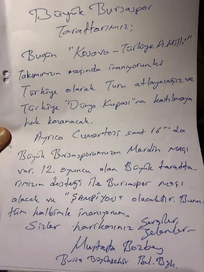 İfade işlemleri süren Bozbey’den Bursa ve Bursasporlulara hitaben mektup geldi.