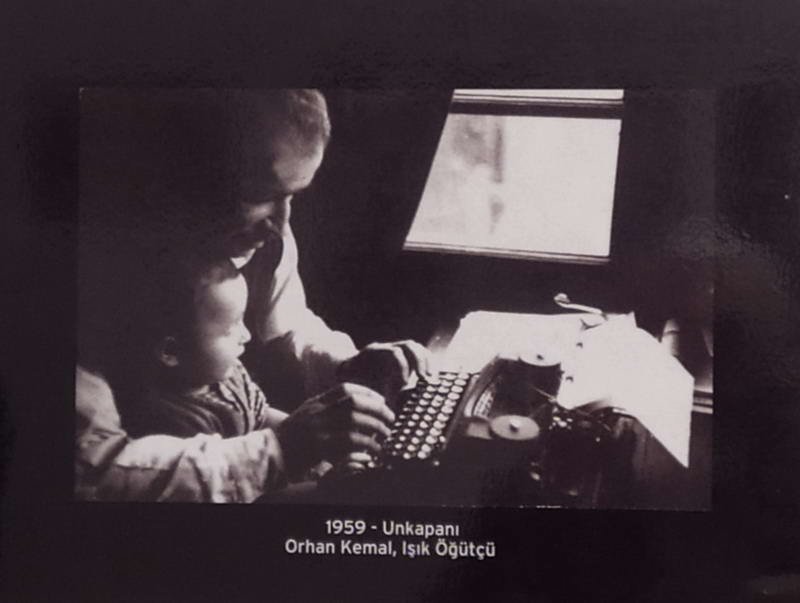 O daktilo ki, hemen arkasındaki bir fotoğraf dikkat çekiyor: Orhan Kemal aynı daktiloda yazısını yazıyor, kucağında da oğlu oturuyor, olasılıkla henüz 2-3 yaşında.