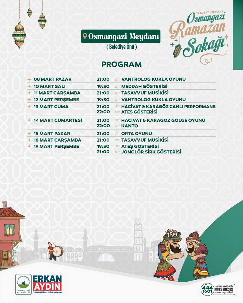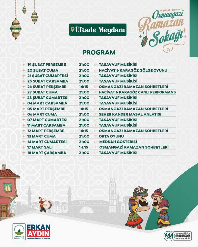 Osmangazi Ramazan Sokağı, birlik, beraberlik ve paylaşma duygularının en güzel şekilde yaşanacağı adreslerden biri olacak. Geleneksel sanatlar, sahne gösterileri, tasavvuf musikisi dinletileri ve çocuklara özel etkinliklerle Osmangazi’de Ramazan akşamları adeta bir şenlik havasında geçecek. Program kapsamında Karagöz ve Hacivat gölge oyunları, canlı performanslar, meddah gösterileri, orta oyunları, vantrolog kukla oyunları, Aşuk ile Maşuk gösterileri izleyiciyle buluşacak. Ateş ve jonglör sirk gösterileri ise Ramazan gecelerine görsel bir şölen sunacak.