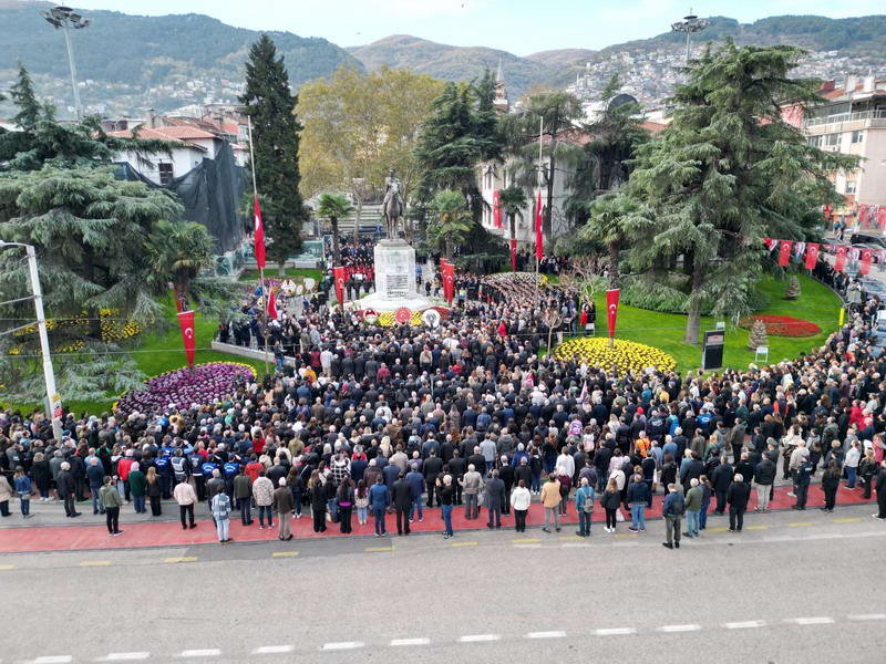 Türkiye Cumhuriyeti’nin kurucusu Gazi Mustafa Kemal Atatürk, ebediyete uğurlanışının 87. yıl dönümünde tüm yurtta olduğu gibi Bursa’da da törenlerle anıldı. ‘Anı Defteri’ standını ziyaret ederek duygularını satırlara döken Başkan Mustafa Bozbey, “Sizin bize emanet ettiğiniz Türkiye Cumhuriyeti’ne sahip çıkıyoruz, sahip çıkmaya O’nu her türlü bedbahttan korumaya kararlıyız” dedi. Bursa Valiliği tarafından Heykel’de düzenlenen anma programı, Bursa Valiliği, Bursa Büyükşehir Belediyesi ve Garnizon Komutanlığı’na ait çelenklerin Atatürk Heykeli’ne sunulmasıyla başladı. Saatler 09.05’i gösterdiğinde sirenlerin çalmasıyla birlikte Bursa’da hayat bir dakikalığına tamamen durdu. Vatandaşlar araçlarından inerek saygı duruşunda bulundu. Bazı vatandaşlar da törene cam ve balkonlarından eşlik etti.