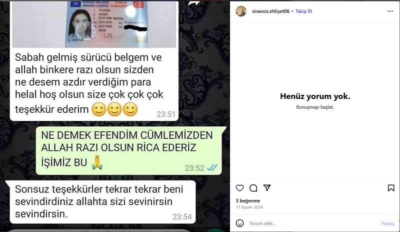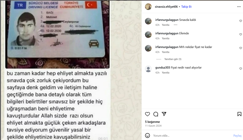Geçtiğimiz aylarda ortaya çıkan sahte diploma skandalının yankıları henüz dinmemişken, yeni bir sahtecilik daha ortaya çıktı. Sosyal medyada sınavsız ehliyet satışı yapıldığına ve belgenin e-Devlete işlendiğine dair sayısız ilan paylaşıldığı görüldü. İlanların yanında sınavsız ehliyet aldığı iddia edilen vatandaşların videoları da yayımlandı.
