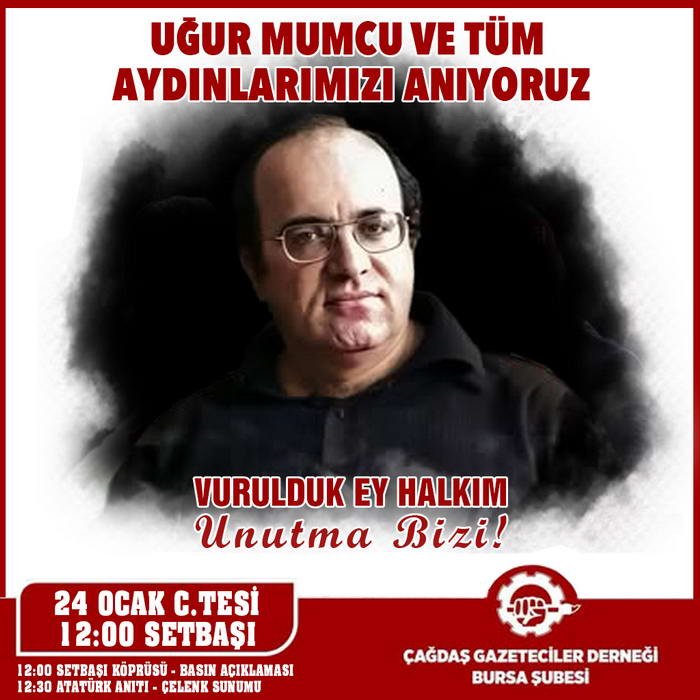 Bursa’da da Çağdaş Gazeteciler Derneği Bursa Şubesi’nin öncülüğünde 24 Ocak 2026 Cumartesi günü saat 12.00’de Setbaşı Köprüsü üzerinde yapılacak basın açıklamasının ardından Atatürk Anıtına çelenk sunumu gerçekleştirilecek.