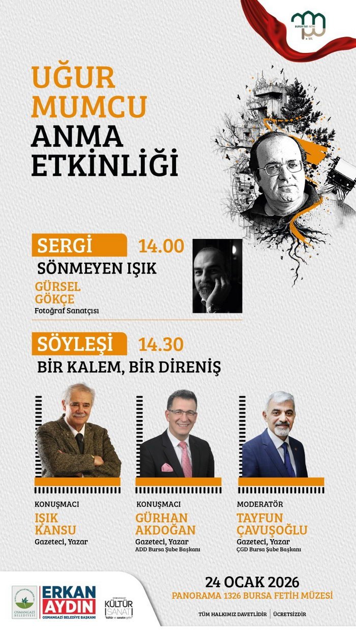 Bu çerçevede Bursa Osmangazi Belediyesi’nin ev sahipliğinde Panorama 1326 Bursa Fetih Müzesi’nde saat 14:00‘te düzenlenecek etkinlikte ise “Sönmeyen Işık Uğur Mumcu” fotoğraf sergisi ve panel yapılacak. Gazeteci ve fotoğraf sanatçısı Gürsel Gökçe’nin Mumcu’nun cenaze töreni ve sonrasında düzenlenen anma etkinliklerinde çektiği fotoğraflardan oluşan fotoğraf sergisinin ardından ÇGD Bursa Şube Başkanı Tayfun Çavuşoğlu‘nun moderatörlüğünü yapacağı panelde Cumhuriyet gazetesi yazarı Işık Kansu ve ADD Bursa Şube Başkanı Gürhan Akdoğan konuşacak.